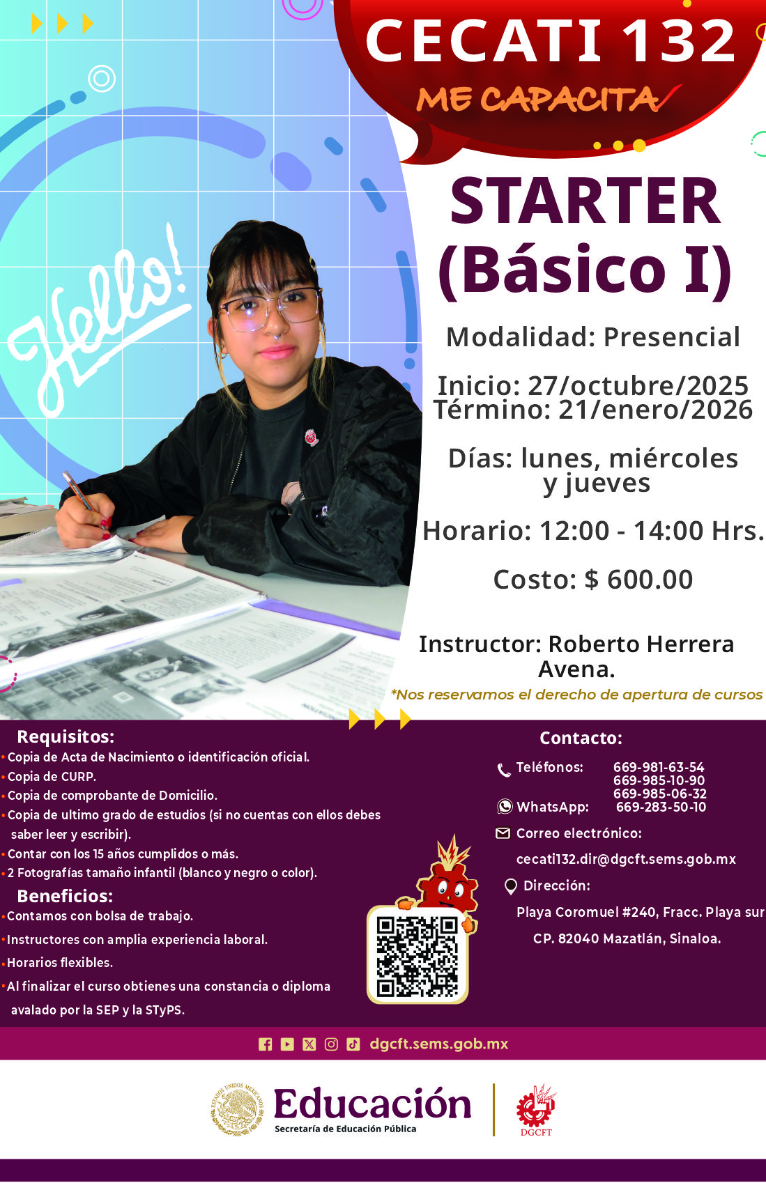 MODALIDAD: PRESENCIAL LUNES, MIERCOLES Y JUEVES 09:00-12:00 HRS